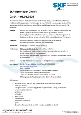 Abfahrt: Anreise am Donnerstag, 02.04.2026 um 17.00 Uhr oder nach Absprache. Der Klubbus geht anschliessend am Ostermontag den 06.04.2026 ins Trainingslager nach Sainte Pierre de Boeuf. Wer eine Mitfahrgelegenheit ab Solothurn und/oder wieder retour benötigt, meldet dies bei der Anmeldung.