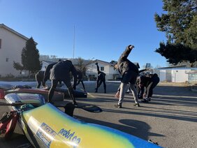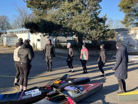 Trotz wunderbarem und sonnigem Wetter mussten sich die Kanuten auch auf der ruhigen Aare sehr warm anziehen. Paddelhandschuhe, warme Kopfbedeckung und Halsschal waren Pflicht. Trotzdem sorgte die kalte Bise bei einigen der Paddler und Paddlerinnen für kalte Finger oder kalte Ohren. Auch trainingstechnisch wurden alle gefordert. Durch die aktuell kaum vorhandene Strömung und den Gegenwind dauerte die Fahrt statt wie gewohnt ca. 1h30 diesmal deutlich länger.